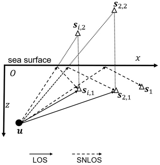 Figure 1 depicts the source localization model. The unknown underwater source is denoted as , while the M sensor nodes are positioned at . The virtual sensor positions, which correspond to the SNLOS link, are mirror images of the sensor positions relative to the sea surface and are located at . For the purposes of TDOA measurement, is designated as the reference node, and only its LOS link is taken into account.