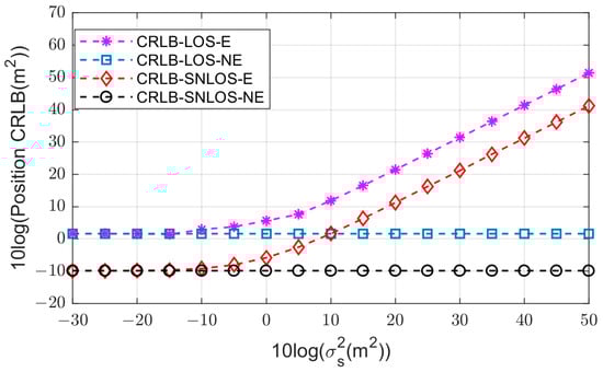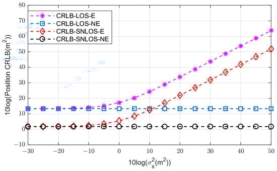Figure 2 displays the CRLBs for the four cases with increasing noise power, where a stationary source m is positioned near the sensors. In general, incorporating the SNLOS link decreases the CRLB by approximately 10 dB. This improvement is attributed to the introduction of virtual sensors, which enrich the TDOA measurements. The deviation in CRLBs between scenarios with and without sensor position errors becomes noticeable at , and their magnitude gradually amplifies with higher .