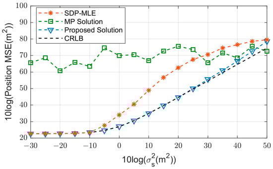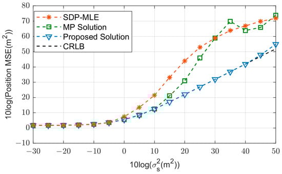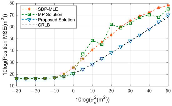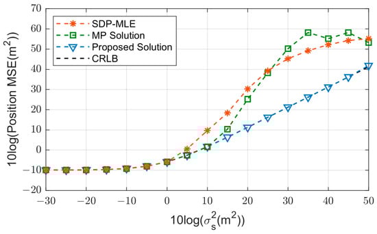 In this section, we conduct simulations to verify the performance of the proposed method and compare it with the CRLB and two existing similar methods. The first is the MP method (referred to as “MP-Solution”), which was developed for shallow water multipath environments, as described in []. By exploiting multipath effects in shallow seas and introducing a single calibration source, the method corrects sensor position errors and enhances localization performance. The other is the SDP method in [], which is utilized as the initial solution for the iterative MLE approach (referred to as “SDP-MLE”) and was devised to tackle sensor position inaccuracies in TDOA localization. It is important to note that the localization models used in these methods differ slightly from the model employed in this article. Further details regarding the model adjustments will be provided in subsequent simulation scenarios. The other simulation parameters are consistent with those in Section 3. Performance evaluation is based on the MSE criterion, defined as , where M represents the number of Monte Carlo runs, and corresponds to the estimate of the true value in the -th run. The number of ensemble runs is set to 5000.
