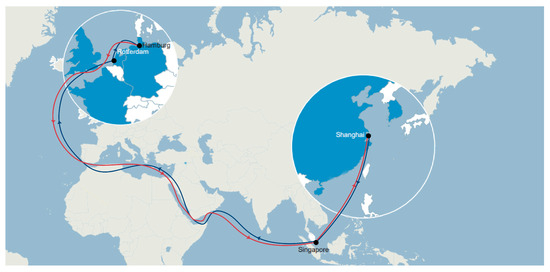 On 18 April 2023, the EU Parliament approved the inclusion of shipping in its Emissions Trading System (ETS) [7]. This decision represents a significant step toward addressing carbon emissions from ships and promoting sustainability within the shipping industry. Specifically, shipping companies need to buy 100% of emissions for voyages within the EU and 50% of emissions for voyages into or out of the EU starting in 2026. This decision represents a significant step towards addressing carbon emissions from ships and promoting sustainability within the shipping industry. Suppose that there is a container shipping route starting from Shanghai (SHA) port, passing through Singapore (SIN) port, Rotterdam (RTM) port, Hamburg (HH) port, and SIN port, and finally returning to SHA port (see Figure 1 for an illustration):