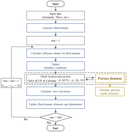 Using the fluid and porous medium model described in the above sections, the wave–porous structure interaction was calculated and nodes were rearranged at each time step. The flowchart of the total process is presented in Figure 1.