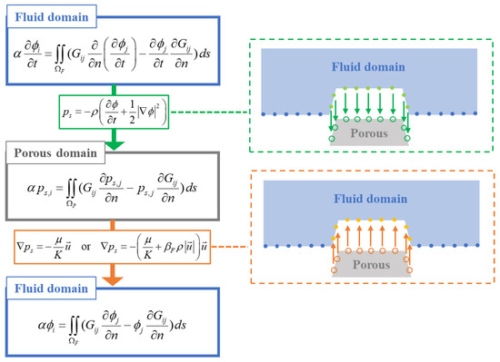 Figure 2 provides greater detail of “the interaction of the fluid and porous domain” process shown in Figure 1. A three-step calculation scheme [36] was used to calculate the coupling of the fluid and porous domains. First, the boundary value problem (BVP) for the time derivative of velocity potential (∂ϕ/∂t) in the fluid domain is solved, and the obtained values are used as the interface boundary condition (Equation (17)) in the porous domain. The boundary condition for ∂ϕ/∂t on the interface between the fluid and the porous domain is assumed to be Equation (19). Then, the time derivative of ∂ϕ/∂n can be obtained from sub-step values of ∂ϕ/∂n in each time step using the finite difference formula [40] as shown in Equation (20).