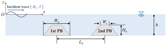 The numerical model of this study was compared with experimental data for verification [27]. Figure 3 presents a schematic diagram of a dual porous breakwater. The detailed setup conditions of the numerical model are as follows: water depth (h) = 0.8 m; incident wave height (HI) = 0.04 m; wave period (T) ranges from 1.29 s to 3.73 s. The submerged breakwater was set up under the following conditions: bottom width (Wb) = 2h; top width (Wt) = 0.5h; height (Hb) = 0.5h; distance between structures (Lb) = 3.6 m. The submerged structure was a tetrapod model in an experimental study [27] and its effective diameter (d50) and porosity (n) were 0.076 m and 0.5 m, respectively [28].