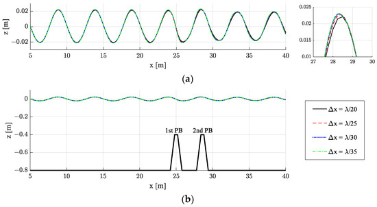 Convergence test with increasing number of nodes for the non-porous dual breakwater [HI = 0.04 m, Lb = 3.6 m, kh = 1.0, T = 2.06 s]: (a) Enlarged wave elevation; (b) Simulation overview.
