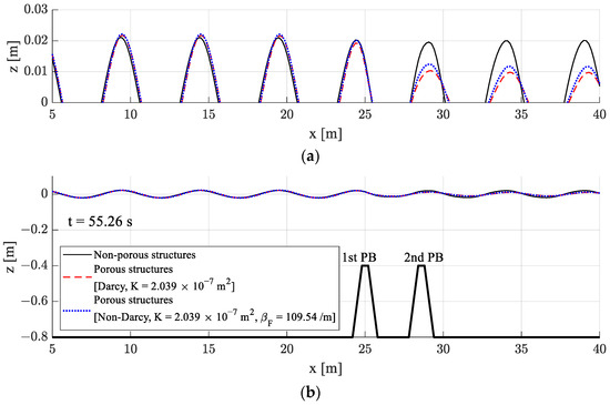 Comparison of the wave deformation over a submerged dual breakwater according to the distance between dual breakwaters [Non-Darcy flow (K = 2.039 10−7 m2, βF = 109.54/m), HI = 0.04 m, kh = 1.5, T = 1.54 s]: (a) Enlarged wave elevation; (b) Simulation overview.