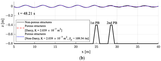 Based on previous studies, applying Darcy’s flow boundary condition was sufficiently valid under small permeability conditions [36]. In the case of relatively high permeability, however, more accurate results can be obtained by applying the non-Darcy flow boundary condition, especially in short wave regions, as illustrated in Figure 6. When the flow in the highly porous structures was assumed to be Darcy flow, the reflected and transmitted waves were greatly attenuated, which implies greater wave dissipation than in the non-Darcy flow case. In general, when the porous structure was used, the fluctuations of reflection and transmission coefficients corresponding to the wavelengths or the distances between dual structures were reduced. The effect of the porous structure was greater for transmitted waves than reflected waves, and more wave energy was dissipated when using the porous structure. However, the transmission coefficients were relatively insensitive to the gap distances.