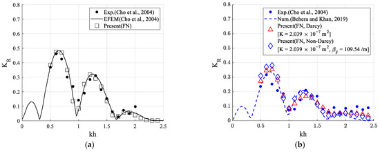 Figure 7 compares the wave reflection coefficients with previous experimental and numerical data (Eigenfunction expansion method, EFEM). The present results from the FN-NWT are generally in good agreement with the other datasets for both non-porous and porous structure conditions. For porous structures, the wave reflection coefficients were similar to the previous study data, except in the long wave region (kh = 0.5–0.7). Notably, at the second maximum peak (around kh = 1.3), the wave reflection coefficients applying the non-Darcy (Forchheimer) flow boundary condition (Equation (12)) showed more similar results compared with the experimental and calculation results than the result of applying the Darcy flow boundary condition (Equation (11)). The reduction of the reflected wave amplitude is noticeable, especially at the respective peaks. While Darcy’s method underestimates the reflection coefficient. This is especially the case in the range of kh = 1.2–1.4, where there is a fairly good agreement between the non-Darcy-based FN-NWT and the experimental results. This shows that the non-Darcy approach produces better results than the Darcy-based approach.