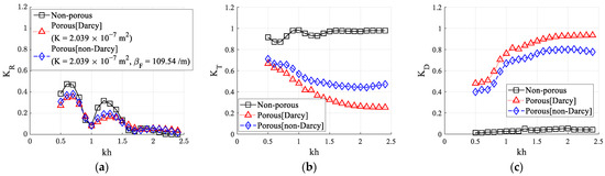 Comparison of the reflection, transmission, and dissipation coefficients by porous [Non-Darcy flow (K = 2.039 10−7 m2, βF = 109.54/m), HI = 0.04 m] structures for various wavelength (kh): (a) Wave reflection coefficient (KR); (b) Wave transmission coefficient (KT); (c) Wave dissipation coefficient (KD).