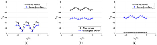 Comparison of the reflection, transmission, and dissipation coefficients between the non-porous and porous structures [Non-Darcy flow (K = 2.039 10−7 m2, βF = 109.54/m)] for the distance between structures [HI = 0.04 m, kh = 1.0]: (a) Wave reflection coefficient (KR); (b) Wave transmission coefficient (KT); (c) Wave dissipation coefficient (KD).