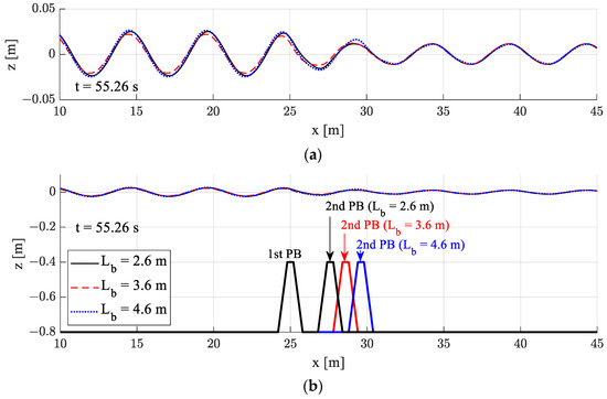 In Figure 10a, a slight phase difference was observed with different distances between structures at long wave condition in the region of the reflected waves (x = 10–25 m), but the phases of transmitted waves were almost same. The phase shift of reflected waves was less pronounced in shorter waves because seabed structures are less affected by shorter waves. The dimensionless structure spacing normalized by wave length (Lb/λ) was used in Figure 13 for three representative wave lengths.