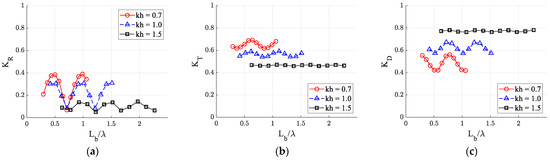 Figure 13 compares their differences according to wavelength (kh). As the wavelength becomes shorter (kh increases), the difference in each coefficient according to the distance between the dual porous structure was not large (Figure 13). This is because the seabed effect decreases as the water depth increases relative to the wavelength (h/λ). Regardless of wavelength, the values of Lb/λ corresponding to the maximum and minimum values of each coefficient are similar. However, the effect of distance between structures decreased in larger kh (i.e., in deeper water or with shorter wave length). As shown in Figure 8, the dissipation coefficient increases with shorter wavelengths.