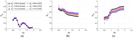 Figure 14 also shows the differences in wave coefficients according to linear and fully nonlinear calculations. As the wave non-linearity increases (the incident wave height increases), the differences in the transmission and dissipation coefficients were observed more clearly, while the reflection coefficients remain similar. When comparing the linear and fully nonlinear results, their differences are noticeable in higher incident wave amplitudes at kh values lower than 0.7.
