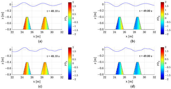 Figure 16 shows the pore pressure distribution in the porous structure for large incident wave height (HI = 0.12 m) and kh = 1.2. Figure 16a,b present linear simulation results, and Figure 16c,d show fully nonlinear simulation results. As the wave passes over submerged structures, the deformation of wave shapes and phases by the submerged structures leads to differences in the pore pressure distribution between linear and fully nonlinear cases. The pressure magnitude/fluctuation of the of the front structure is generally higher than that of the rear structure. The pressure differences between the linear and nonlinear cases are also more noticeable at the rear structure due to more wave deformations after passing the front structure in the fully nonlinear results.