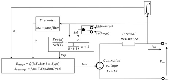 where is battery voltage, is battery constant voltage, K is polarisation constant, Q is battery capacity, it is actual battery charge, calculated as , R is internal resistance, is battery current, is filtered current, A is the exponential zone amplitude, and B is the inverse of the exponential zone time constant. This battery generic model has been validated by Tremblay and Dessaint [30]. In their work, the simulation results demonstrated good agreement with the datasheet from the manufacturer. The application of a model in a hybrid power system has been introduced in the work of Evangelou and Shukla [31] and Bassam et al. [32].