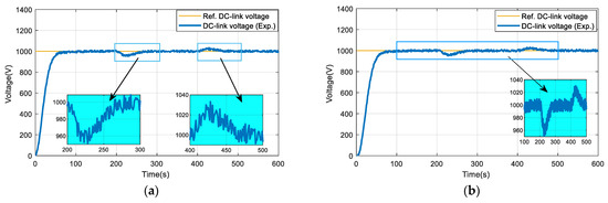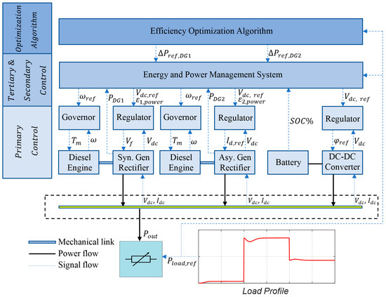 As mentioned in the description of Figure 5, there are two modes involved in the proposed hybrid power system. In the hybrid mode, the ESS will play a role to regulate the DC-link voltage, and the DGRS sets will work at the optimal power set-points. Thus, the control signals are derived from Equation (29). In the diesel electric mode, the DGRS sets need to maintain the DC-link voltage, instead of ESS. In this condition, the secondary controller will be shut down. The on–off-switching state of the secondary controllers is presented in Table 1.
