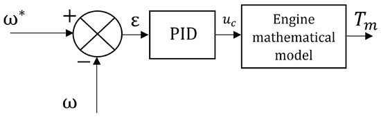 (1) Governor: The speed of the diesel engines is regulated by PID controllers to provide reference torque to drive the diesel generator rectifier system, which is based on the speed error between the reference speed and the actual speed. The block diagram of the diesel engine speed control is presented in Figure 6, where is reference speed, is the measured speed normally obtained from in Equation (12), is the speed error, and is the control signal for Equation (1).