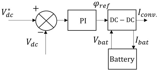 For the model of the DC–DC converter presented in Figure 4, the duty cycle, phase angle shift between LVS and HVS voltages, , and switching frequency, , are the three main control variables. By controlling any of these three or all of them together, power flow can be controlled in either direction [35]. Here, the duty cycle and switching frequency are fixed at constant values of 50% and 20 kHz, respectively. An adjustable leakage inductance is applied to regulate the phase shift , which is set as the unique control signal in this system. A PI controller is used to regulate the DC-link voltage according to the voltage error, and the controller will then generate the reference phase shift, , for the converter to determine the mode of the battery (charge/discharge) according to the sign of the reference phase shift. The control system output DC current, , can be generated to balance the target load current. A DC–DC converter has been applied to readjust the net current supplied by the power sources/energy storage devices into the DC bus, assuming a constant efficiency of 95% [32]. This is the primary strategy for bus voltage control in the hybrid mode.