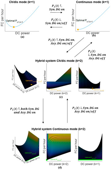 Algorithm of optimal mode determination for three-level control: (a) Ch/dis mode (k = 1), (b) Continuous mode (k = 1), (c) Ch/dis mode (k = 2), (d) Continuous mode (k = 2).