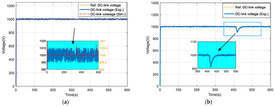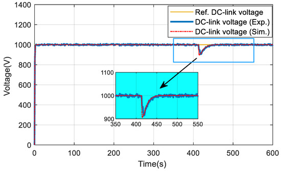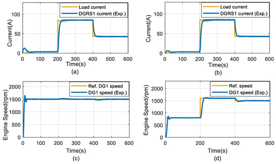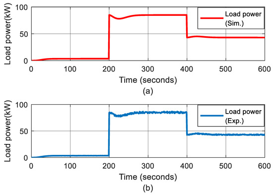 (1) Load Profile: To set up a lab-scale experiment for simulating the ice loading condition (open water heavy ice load light ice load condition), the designed loading power needed to be varied widely. In this scenario, the load power for the experiments is designed in a range of 3.5 kW to 85 kW. Figure 10 presents the load profile for the simulation and the resulting load power in the experiment. The adjustable resistance is connected to the load side to regulate load power accordingly. At the start, the required load power is at a low level to simulate the ship operating in an open water part of the voyage. After 200 s, the required load power increases rapidly to 85 kW after a brief period of oscillation, to examine the power system response to a sudden change to high loading condition when, for example, the ship encounters thick ice. Finally, the required load power drops to 43 kW, corresponding to the ship encountering a thin ice loading condition.