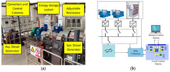 (2) Parameters of System Components: The proposed control method simulation is compared with a set of experimental results collected from the hybrid power lab in the Shanghai Marine Diesel Engine Research Institute (SMDERI). The configuration of the testbed is shown in Figure 11a, with a block diagram of the system with control stations given in Figure 11b. There are two sets of diesel engines and generators with rectifiers, and batteries, which are connected to a DC-bus through DC–DC converters. An adjustable resistance is applied to emulate the load profile shown in Figure 10. Detailed specifications of the equipment can be found in Table 3.