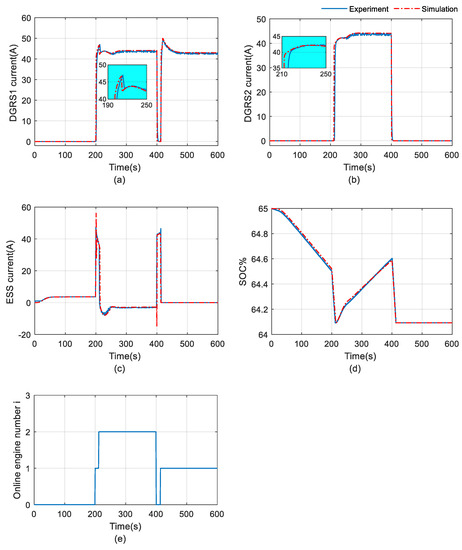 The complete system model and control strategies developed in the previous sections allows the simulation and experiments to be conducted accordingly. In this section, the simulation and experimental results of the DC hybrid power system with the proposed control strategies will be demonstrated and analysed. For the primary control, because of platform settings, the control strategy applied is an on–off control, which is different from the PID control strategy proposed in the modelling and simulation stage. However, the secondary and tertiary control with a proposed efficiency algorithm has been adopted in the PMS system. Thus, the platform is partially validated in the present work.