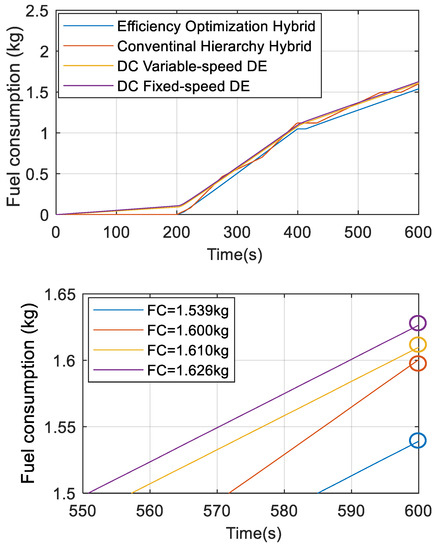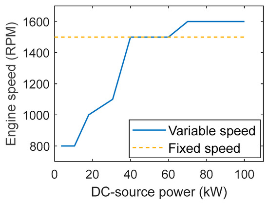 where and are the DC-source powers for engine number 1 and engine number 2, respectively. and are the duty cycles for the one and two active engine condition, respectively. , and are coefficients for the synchronous DGRS hourly fuel consumption. , , and are coefficients for hourly fuel consumption when two DGRS sets work together.