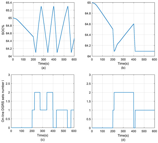 The EMS acts as a tertiary level control system. In this work, the EMS model decides the operation of the generator depending on the priority selection of the power sources. Rule-based EMS strategies have been developed based on battery SOC% and real-time load power, which are given in Table 2. This EMS strategy is based on previous work presented in Zhou et al. [38]. The load power, the DGRS power reference, the minimum DGRS power, and the optimal DGRS power are denoted by , , , and , respectively. Consequently, whether the battery is charging (Ch.) or discharging (Dis.) can be determined by the reference power settings of the DGRS.