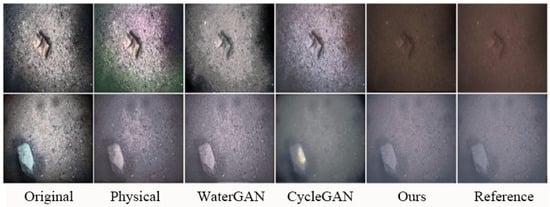 Physical model-based methods. Since seawater absorbs light and the degree of attenuation is affected by the wavelength of light, most of the degraded images underwater show degraded characteristics of blue-green colour distortion; in addition, seawater scatters light propagation, making the images imaged underwater have the characteristics of lower contrast, fog effect, and so on. Physical model-based methods are usually modelled by the above principles. Guo et al. synthesized an underwater image dataset using 10 Jerlov water types considering depth, wavelength attenuation coefficients, and other parameters for modeling []. Georg et al. generated the VAROS synthetic underwater dataset by building a realistic computer graphic model of a large-scale underwater environment, modelling based on the absorption-scattering parameters of light from the water column []. In addition, Ueda et al. combined the spectral response of the camera to produce more accurate synthetic images [].