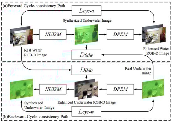 In this section, the CycleGAN structure is improved with the model algorithm shown in Algorithm 2. Among them, the generator includes a synthesis model and an augmentation model, which realize the functions of converting an overwater image to an underwater image, as well as converting an underwater image to an overwater image, respectively. The discriminators discriminate the converted synthetic image and the actual image, respectively. The whole framework will contain two cyclic consistency paths, in which the forward cyclic consistency path starts with the real underwater RGB-D image, generates the synthetic underwater image through HUISM, then generates the enhanced clear underwater RGB-D picture after DPEM as the end point. The reverse cyclic consistency path starts with a real underwater image, then generates an enhanced clear underwater RGB-D picture via DPEM, and finally ends with a reconstructed synthetic underwater image. Specifically, HUISM and DPEM act as model generators to complete the transformation between the underwater and overwater domains learnt from the unpaired images. and act as the discriminators of the model (where discriminates the synthetic underwater image from the real underwater image, and discriminates the augmented clear underwater RGB-D image from the real over-water RGB-D image) to perform adversarial training together with the generator using adversarial loss and cyclic consistency loss. In addition, during the training period of DPEM, the detection of favourable information is fed back in the form of a gradient through the perceptual loss of target focusing or plate detection to improve the subsequent target detection ability of the formed realistic image.