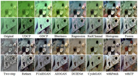 - Vijay Anandh, R.; Rukmani Dev, S.; Preetham, S.; Pratheep, K.; Reddy, P.B.P.; Ram Aravind, U. Qualitative Analysis of Underwater Image Enhancement. In Proceedings of the 2021 5th International Conference on Trends in Electronics and Informatics (ICOEI), Tirunelveli, India, 3–5 June 2021; pp. 1225–1230. [Google Scholar]