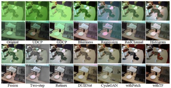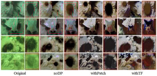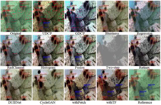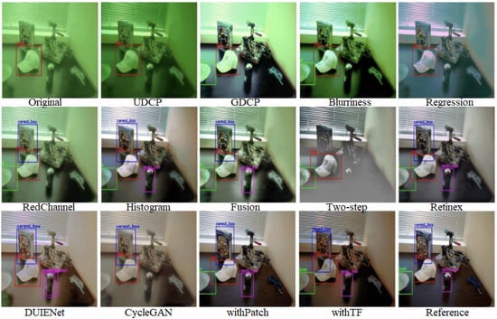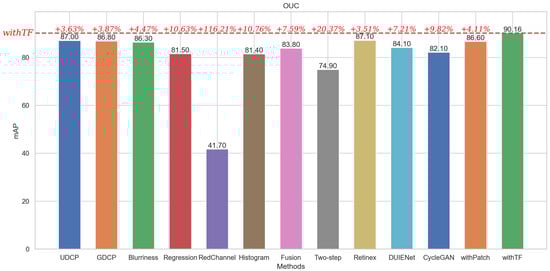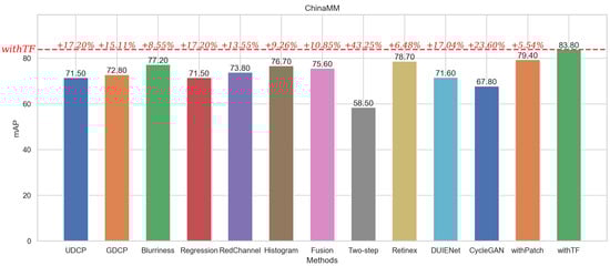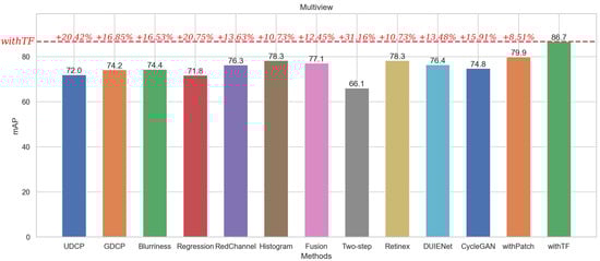 Among them, withTF achieves the optimal value of the mAP evaluation metrics based on its property of ignoring the background patch information in the default patch while highlighting the category and location information of the target patch. In the ChinaMM dataset, withTF improves the detection accuracy by 43.25% compared with the algorithm Two-step, which has the lowest evaluation value, and improves the detection accuracy by 6.48% compared with the algorithm Retinex, which has the highest evaluation value. In the Multiview dataset, withTF’s value improved by 31.16% compared to the worst algorithm and 10.7% compared to the better algorithm. In the OUC dataset, WithTF achieved a high score of 90.16, which is a 116.21% improvement over the worst algorithm and 3.51% improvement over the better algorithm.