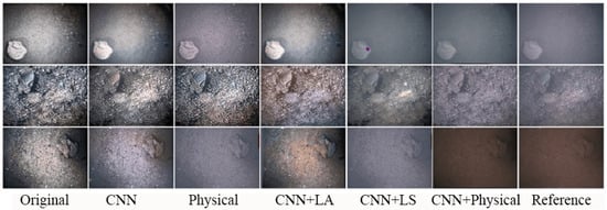 Component analysis of HUISM. For HUISM, we tried to test the CNN, LA and LS and the full physics module (consisting of LA and LS) and analyze its role. Figure 14 and Figure 15 show the ablation study under the Multiview and OUC datasets. The effects produced by the CNN alone and the CNN+LA are still clear, while the effects with the LS the synthesized effect is blurred, indicating that light scattering brings a blurring effect to the image. Light absorption produces a different colour tone to the original image, avoiding the artifactual effect of the image. The synthesized effects of CNN and physical modules only have a single style, and the degradation features are all the same. The former is due to the deep learning model pattern collapse problem, and the latter is due to the training optimization of the fixed parameters of the physical model. Once the CNN and physics modules are fused, they form a complementary advantage, making the synthesized effect similar to the reference image.