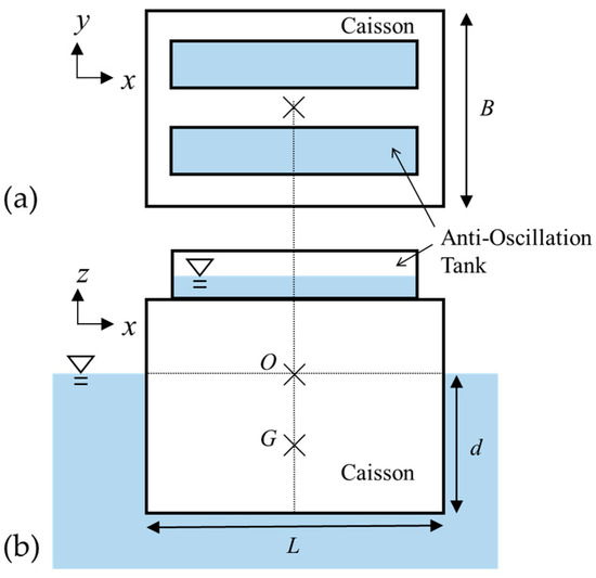 Floating caisson and anti-oscillation tanks: (a) top view and (b) cross-sectional view.