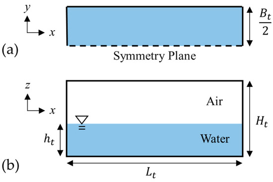 The fluid flow in the anti-oscillation tank was analyzed using the free open-source CFD software OpenFOAM v2012, released by OpenCFD [40]. Rectangular anti-oscillation tanks were used in the physical experiments [2] for comparison. As such, a rectangular computational domain of Figure 3 was used for the fluid flow. It is noteworthy that only half of the tank was analyzed, assuming the symmetry to reduce the computational cost. In Figure 3, Lt is the total inner length of the tank, Bt the total inner width of the tank, Ht the total inner height, and ht the water depth of the tank, respectively. The tank had a lid. Hence, there was neither inflow nor outflow from the outside. The fluid in the tank was treated as a transient, incompressible, isothermal, two-immiscible-phase (water and air) Newtonian fluid. From visual observation in the physical experiments, the flow in the tank was judged to be turbulent. As a turbulence model, the Smagorinsky model [41] of the large-eddy simulation (LES) was used following Kajishima and Taira [42], who recommend using it for this kind of complex flow. An interFoam solver based on the volume-of-fluid (VOF) method was used to track the complex motion of the air–water interface. The governing equations are expressed as follows: