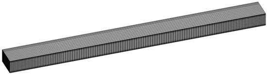 Parallel computation was performed to further reduce the computational time. Figure 4 shows numerical mesh for the flow model. The cross-section at the front of the figure shows the center cross-section of the tank, which corresponds to the symmetry plane in Figure 3. The mesh spacing was set to 3.0 and 0.8 mm in the horizontal (x and y directions) and vertical directions (z direction), respectively. Additionally, as shown in Figure 4, the mesh near the wall was refined. The pressure-implicit with splitting of operators (PISO) algorithm was used for pressure–velocity coupling. The explicit Euler method was used for the time discretization. The time increment was set at 0.0005 s initially and automatically adjusted to a maximum Courant number of 0.5. A second-order total variation diminishing (TVD) scheme by Van Leer was used to discretize the divergence of the flow velocity and VOF function. Table 1 shows the wall boundary conditions used in the flow model. A no-slip condition was used as the boundary condition for the tank walls to match the flow velocity with the moving velocity of the walls. The wettability of the walls was determined by specifying the contact angle as the wall boundary condition for the VOF function. As shown in Table 2, common values for water and air were used as parameters of the flow model.