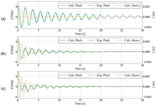 Comparison of the pitch β and heave ζ of the floating caisson using different water depths ht in the anti-oscillation tanks in the free-oscillation tests: (a) ht = 0 mm, (b) ht = 2.6 mm, and (c) ht = 5.2 mm.