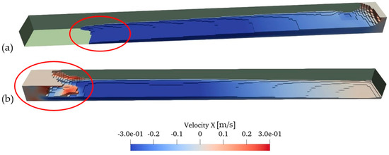 Water surface profile and x-directional flow velocity in the backward half side of the anti-oscillation tank for ht = 5.2 mm: (a) 0.96 s after the oscillation start and (b) 1.40 s after the oscillation start.