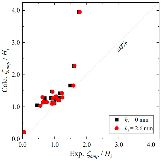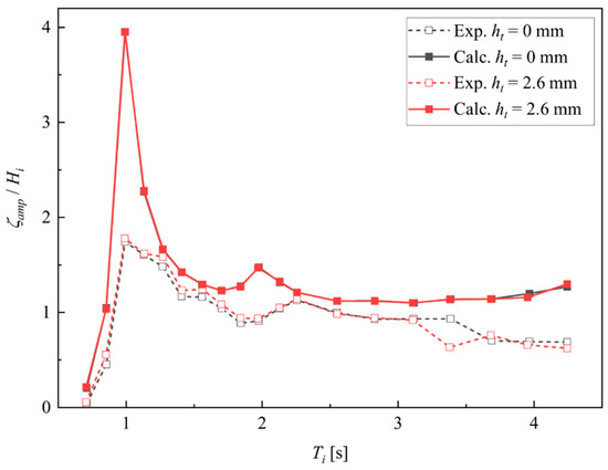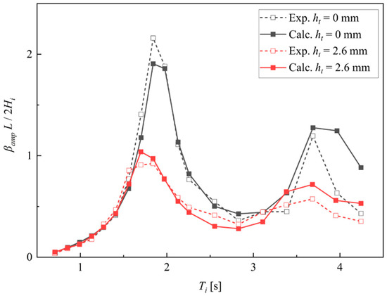 Figure 8 and Table 5 and Table 6 show a comparison of the total amplitudes of the pitch of the caisson, where L is the length of the caisson (Figure 1 and Table 3). As shown herein, the total amplitude of the pitch calculated using the coupled model corresponds with the experimental data regardless of the presence or absence of the tank water. Furthermore, we can observe from the calculated and measured results that pouring water into the tanks can reduce the total amplitude of the pitch , particularly around the peaks. However, for no tank water (ht = 0.0 mm; black lines in Figure 8), the total amplitude of the pitch was slightly underestimated around the maximum. This is probably because the wave exciting moment cannot be estimated by integrating the Froude–Krylov force with sufficient accuracy when the caisson pitch is large. Contrarily, in the presence of the tank water (ht = 2.6 mm; red lines in Figure 8), the total amplitude of the pitch was slightly overestimated around the maximum. This is presumably owing to the underestimation of the damping induced by the tank water. Figure 8 illustrates that there is a slight difference in the total amplitude of the pitch for longer-period waves than Ti = 3.2 s regardless of the presence or absence of the tank water. This is because the incident waves possibly contained high-frequency components owing to the limitation of the wave generator in the physical experiments, while the incident waves with high-frequency components could not be approximated using the second-order Stokes wave theory. Figure 9 shows the relationship between the experimental and calculated values of the non-dimensional total amplitude of the pitch . For long-period waves of Ti > 3.2 s, as mentioned earlier, the calculated results slightly overestimated the experimental data. However, the coupled model can predict the experimental data within ±20% for Ti < 3.2 s.