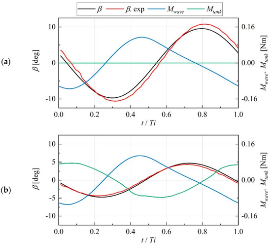 Time series of the pitch β, wave exciting moment , and internal fluid moment for Ti = 1.84 s: (a) ht = 0 mm and (b) ht = 2.6 mm.