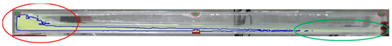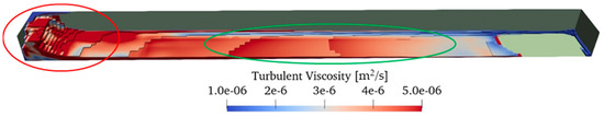 Figure 13 shows the calculated water surface profile and x-directional flow velocity when the angular velocity in the pitch direction reaches its maximum (when the tank rotates clockwise). The cross-section at the front of the figure shows the center cross-section of the tank. For comparison, Figure 14 shows the water surface profiles observed in the physical experiments [2]. Here, the water was yellow. This figure shows a side view of the tank, wherein the blue line represents the water surface. As shown in Figure 13 and Figure 14, the coupled model and physical experiments exhibit a similar trend: the tank water is concentrated at the left end of the tank (red circles in Figure 13 and Figure 14), whereas the bottom is exposed on the opposite side (green circles in Figure 13 and Figure 14). Although the mass of the tank water is relatively small (50 g in each tank), Figure 12 shows that the tank water motion can generate a large internal fluid moment, (green line), which is almost equal to the wave excitation moment, (blue line). Figure 15 shows the distribution of the turbulent viscosity calculated from the Smagorinsky model at a similar time to that shown in Figure 14. As shown in Figure 15, the turbulent viscosity increases by more than five times the kinematic viscosity of the water (1.0 × 10−6 m2/s) around the left end of the tank (red circle in Figure 15), thereby suggesting a large energy dissipation in this area. Figure 15 shows that the turbulent viscosity becomes relatively high in the thin tail of the water as well (green circle in Figure 15). In this manner, the flow in the tank can be simulated, analyzed, and evaluated in detail using the coupled model. This reveals that it is essential to use a CFD model such as the proposed coupled model to consider this type of energy dissipation.