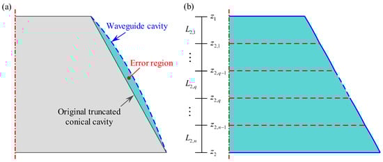 For the non-uniform layer L2, the above exponential waveguide is employed to approximate the rubbery unit. A comparison of these two embedded cavity structures is shown in Figure 2a, where the waveguide cavity is larger than the original truncated conical cavity and there is an error region between them. For this reason, the transfer relations of sound pressure and particle vibration velocity in the L2 layer are precisely informed by utilizing the subdomain splitting method, which consists of the following three steps: (1) equivalently dividing the L2 layer into a stacked structure of n equal-thickness sublayers; (2) adopting exponential waveguides to approximate the rubber units within each sublayer; (3) analyzing the fundamental transfer relations of sound pressure and particle vibration velocity in each sublayer.