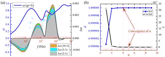 Furthermore, the relationship between these two indexes with the subdomain splitting number is calculated theoretically as shown in Figure 4b, where PCC increases and then stabilizes, while SSE shows a trend of decreasing and then stabilizing. For the purpose of obtaining the minimum stratification number of the inhomogeneous layer L2, two critical values of PCC and SSE, namely δp = 1 and ep = 1 × 10−6, are preset in this article. As depicted in Figure 4b, the PCC and SSE curves start to reach the preset values δp and ep, respectively, with the equivalent stratified number of 4 and 5 in order, corresponding to the exact values δ(q=4) = 1 and e(q=5) = 6.63 × 10−7. Then, the minimum number of subdomain segmentations for the non-uniform layer L2 is nmin = 5.