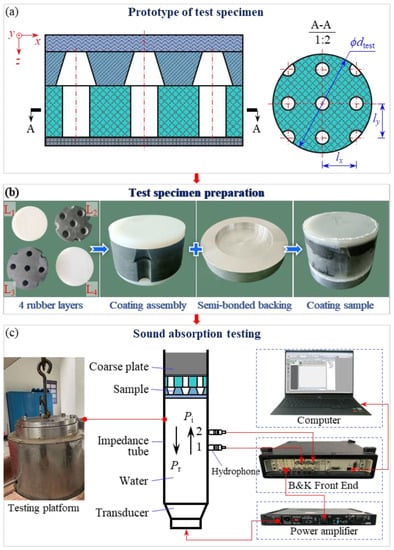 Sound absorption experiment of the present coating in semi-bonded state: (a) prototyping of test specimen, (b) test sample preparation, and (c) sound absorption testing based on a hydroacoustic impedance tube platform.