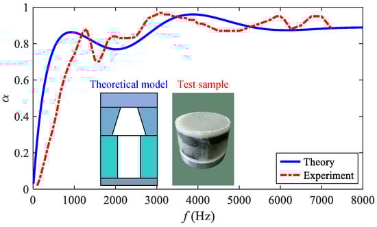Based on the proposed experimental scheme and the Dual-channel Transfer Function Method (DTFM), the sound absorption characteristics of this coating sample in the semi-bonded state are tested in comparison with the theoretical predicted values as shown in Figure 8. In this figure, the theoretical and experimental curves of the global absorption coefficient are highly coincident, and the main absorption peaks of the theoretical curve are accompanied by the corresponding experimental crests. Although there are several oscillatory absorption peaks in the experimental curve, they all keep small variations above and below the theoretical values, and the mean relative error between them is an acceptable 9.92%. Collectively, the comparison results further demonstrate that the proposed global absorption analytical method for an anechoic coating considering the debonding state is highly reliable.