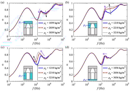 For the composite anechoic coating illustrated in Figure 1, the densities of the four rubber layers are chosen to be ρ1 = (1039, 2039, 3039) kg/m3, ρ2 = ρ3 = (1210, 2210, 3210) kg/m3, and ρ4 = (1056, 2056, 3056) kg/m3, with a density increment of 1000 kg/m3 as the reference. In turn, the corresponding theoretical models are sequentially developed to predict the global sound absorption coefficients as shown in Figure 10.