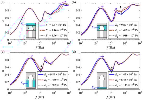 Sound absorption characteristics in the semi-bonded state with respect to the Young’s modulus of each rubber layer: (a) E1, (b) E2, (c) E3, and (d) E4.