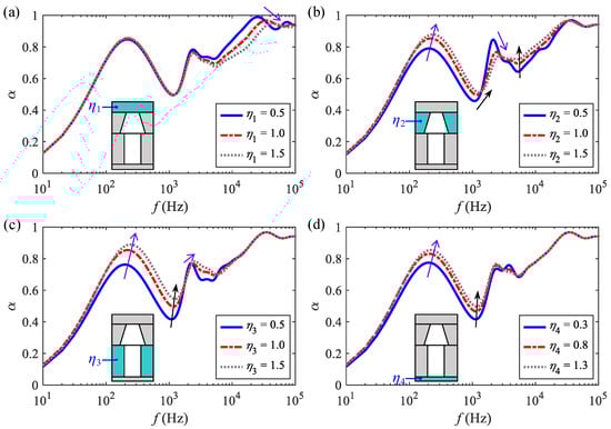 Sound absorption properties in the semi-bonded state as a function of the damping loss factor of each rubber layer: (a) η1, (b) η2, (c) η3, and (d) η4.
