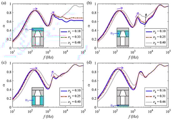 Sound absorption coefficients in the semi-bonded state depending on the Poisson’s ratio of each rubber layer: (a) υ1, (b) υ2, (c) υ3, and (d) υ4.
