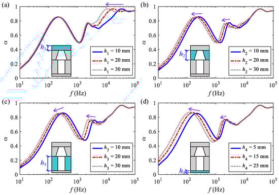 Referring to the thicknesses of the four sublayers in this composite covering, h1 = h2 = h3 = (10, 20, 30) mm and h4 = (5, 15, 25) mm are chosen at a spacing of 10 mm. Based on the univariate principle and the physical parameters in Table 1, the global sound absorption coefficients are theoretically determined in turn, as depicted in Figure 14.