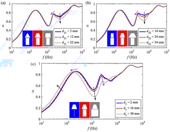 Sound absorption characteristics in the semi-bonded state as a function of cavity diameters: (a) d21, (b) d22, and (c) d3.
